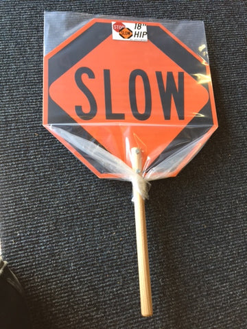 A standard .063 thick aluminum sign. Side one: STOP, Side two: SLOW. Handles are 15" long which leaves a full 12" handle.